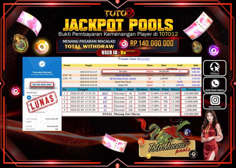Selamat kepada Member Kami Be****** Telah Jackpot dan berhasil mendapatkan kemenangan besar pada permainan JACKPOT POOLS PASARAN (MACAU 4D) Dengan Kemenangan Sebesar Rp.140.000.000 –. Setelah mengisi Fomulir Withdraw dengan Kurang waktu 1-2 Menit Dana sudah kami Trasnfer kepada Pemilik Userid dan dana sudah dapat di cairkan oleh pemenang. Bukti Pembayaran yang TOTO12 berikan merupakan Bukti Pembayaran…