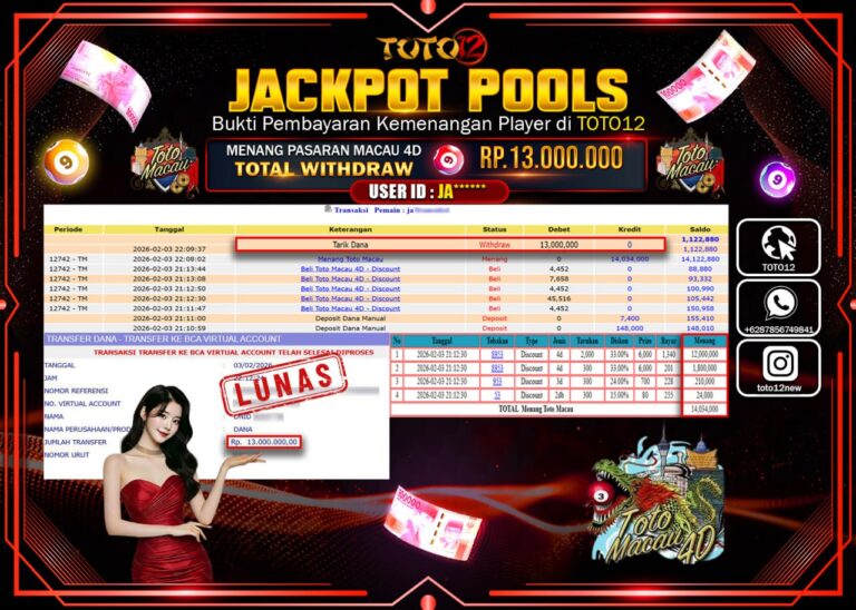 Selamat kepada Member Kami Ja****** Telah Jackpot dan berhasil mendapatkan kemenangan besar pada permainan JACKPOT POOLS PASARAN (MACAU 4D) Dengan Kemenangan Sebesar Rp.13.000.000 –. Setelah mengisi Fomulir Withdraw dengan Kurang waktu 1-2 Menit Dana sudah kami Trasnfer kepada Pemilik Userid dan dana sudah dapat di cairkan oleh pemenang. Bukti Pembayaran yang TOTO12 berikan merupakan Bukti Pembayaran…