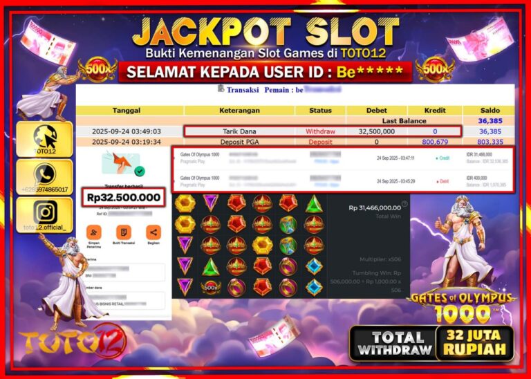 Selamat kepada Member Kami Be****** Telah Jackpot dan berhasil mendapatkan kemenangan besar pada permainan JACKPOT SLOT GAME (GATES OF OLYMPUS 1000) Dengan Kemenangan Sebesar Rp.32.500.000 –. Setelah mengisi Fomulir Withdraw dengan Kurang waktu 1-2 Menit Dana sudah kami Trasnfer kepada Pemilik Userid dan dana sudah dapat di cairkan oleh pemenang. Bukti Pembayaran yang TOTO12 berikan merupakan…
