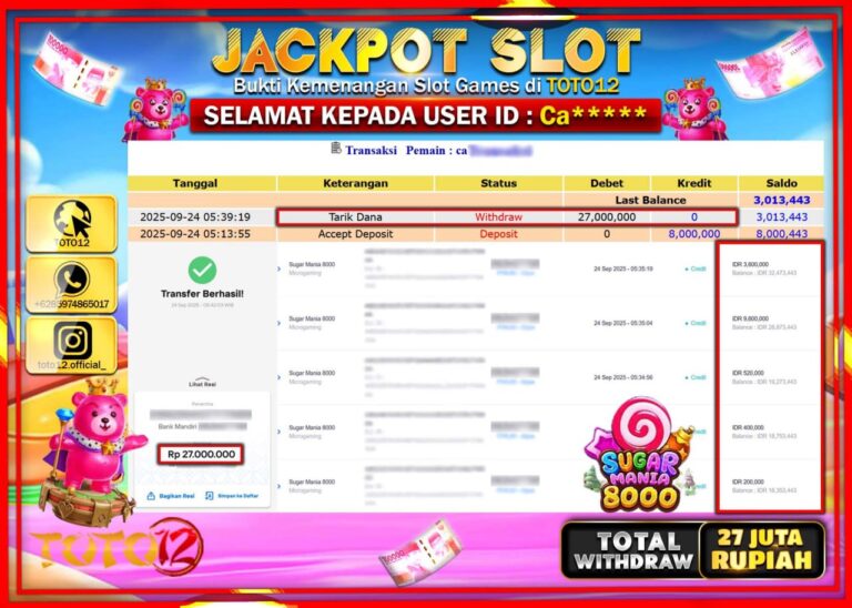 Selamat kepada Member Kami Ca****** Telah Jackpot dan berhasil mendapatkan kemenangan besar pada permainan JACKPOT SLOT GAME (SUGAR MANIA 8000) Dengan Kemenangan Sebesar Rp.27.000.000 –. Setelah mengisi Fomulir Withdraw dengan Kurang waktu 1-2 Menit Dana sudah kami Trasnfer kepada Pemilik Userid dan dana sudah dapat di cairkan oleh pemenang. Bukti Pembayaran yang TOTO12 berikan merupakan Bukti…