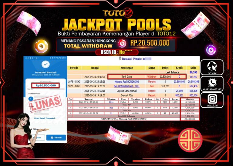 Selamat kepada Member Kami Ho****** Telah Jackpot dan berhasil mendapatkan kemenangan besar pada permainan JACKPOT POOLS PASARAN (HONGKONG) Dengan Kemenangan Sebesar Rp.20.500.000 –. Setelah mengisi Fomulir Withdraw dengan Kurang waktu 1-2 Menit Dana sudah kami Trasnfer kepada Pemilik Userid dan dana sudah dapat di cairkan oleh pemenang. Bukti Pembayaran yang TOTO12 berikan merupakan Bukti Pembayaran yang …
