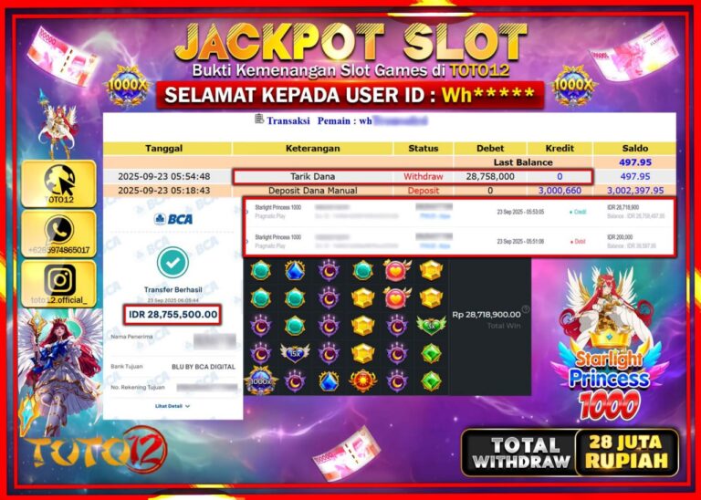 Selamat kepada Member Kami Wh****** Telah Jackpot dan berhasil mendapatkan kemenangan besar pada permainan JACKPOT SLOT GAME (STARLIGHT PRINCESS 1000) Dengan Kemenangan Sebesar Rp.28.758.000 –. Setelah mengisi Fomulir Withdraw dengan Kurang waktu 1-2 Menit Dana sudah kami Trasnfer kepada Pemilik Userid dan dana sudah dapat di cairkan oleh pemenang. Bukti Pembayaran yang TOTO12 berikan merupakan Bukti…