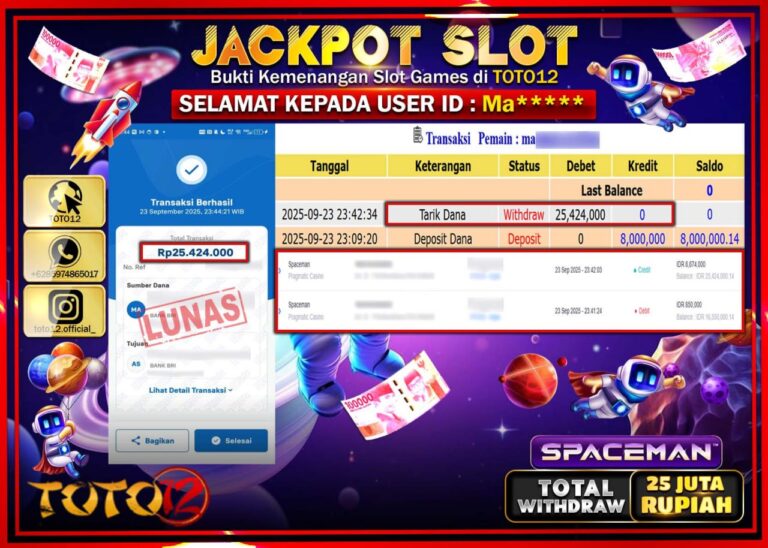 Selamat kepada Member Kami Ma****** Telah Jackpot dan berhasil mendapatkan kemenangan besar pada permainan JACKPOT SLOT GAME (SPACEMAN) Dengan Kemenangan Sebesar Rp.25.424.000 –. Setelah mengisi Fomulir Withdraw dengan Kurang waktu 1-2 Menit Dana sudah kami Trasnfer kepada Pemilik Userid dan dana sudah dapat di cairkan oleh pemenang. Bukti Pembayaran yang TOTO12 berikan merupakan Bukti Pembayaran yang …