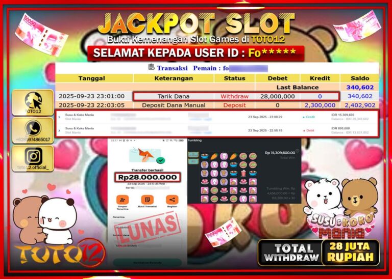 Selamat kepada Member Kami Fo****** Telah Jackpot dan berhasil mendapatkan kemenangan besar pada permainan JACKPOT SLOT GAME (SUSU & KOKO MANIA) Dengan Kemenangan Sebesar Rp.28.000.000 –. Setelah mengisi Fomulir Withdraw dengan Kurang waktu 1-2 Menit Dana sudah kami Trasnfer kepada Pemilik Userid dan dana sudah dapat di cairkan oleh pemenang. Bukti Pembayaran yang TOTO12 berikan merupakan…