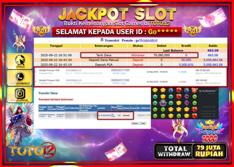 Selamat kepada Member Kami Go***** Telah Jackpot dan berhasil mendapatkan kemenangan besar pada permainan JACKPOT SLOT GAME (STARLIGHT PRINCESS 1000) Dengan Kemenangan Sebesar Rp.79.080.000 –. Setelah mengisi Fomulir Withdraw dengan Kurang waktu 1-2 Menit Dana sudah kami Trasnfer kepada Pemilik Userid dan dana sudah dapat di cairkan oleh pemenang. Bukti Pembayaran yang TOTO12 berikan merupakan Bukti…