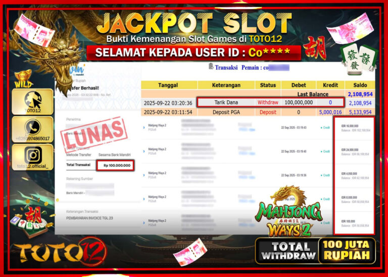 Selamat kepada Member Kami Co**** Telah Jackpot dan berhasil mendapatkan kemenangan besar pada permainan JACKPOT SLOT GAME (MAHJONG WAYS 2) Dengan Kemenangan Sebesar Rp.100.000.000 –. Setelah mengisi Fomulir Withdraw dengan Kurang waktu 1-2 Menit Dana sudah kami Trasnfer kepada Pemilik Userid dan dana sudah dapat di cairkan oleh pemenang. Bukti Pembayaran yang TOTO12 berikan merupakan Bukti…