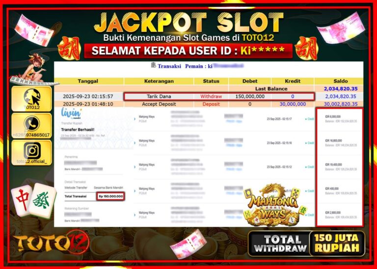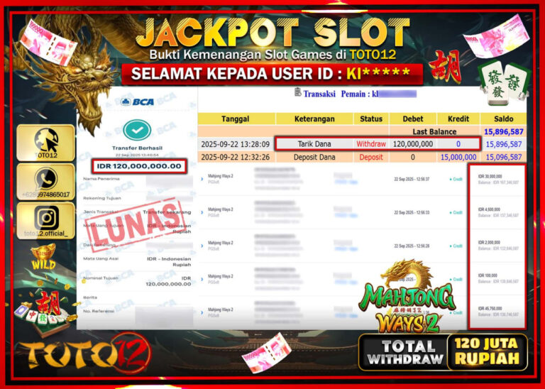 Selamat kepada Member Kami Kl***** Telah Jackpot dan berhasil mendapatkan kemenangan besar pada permainan JACKPOT SLOT GAME (MAHJONG WAYS 2) Dengan Kemenangan Sebesar Rp.120.000.000 –. Setelah mengisi Fomulir Withdraw dengan Kurang waktu 1-2 Menit Dana sudah kami Trasnfer kepada Pemilik Userid dan dana sudah dapat di cairkan oleh pemenang. Bukti Pembayaran yang TOTO12 berikan merupakan Bukti…