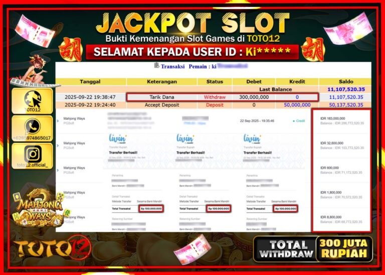 Selamat kepada Member Kami Ki***** Telah Jackpot dan berhasil mendapatkan kemenangan besar pada permainan JACKPOT SLOT GAME (MAHJONG WAYS) Dengan Kemenangan Sebesar Rp.300.000.000–. Setelah mengisi Fomulir Withdraw dengan Kurang waktu 1-2 Menit Dana sudah kami Trasnfer kepada Pemilik Userid dan dana sudah dapat di cairkan oleh pemenang. Bukti Pembayaran yang TOTO12 berikan merupakan Bukti Pembayaran yang …