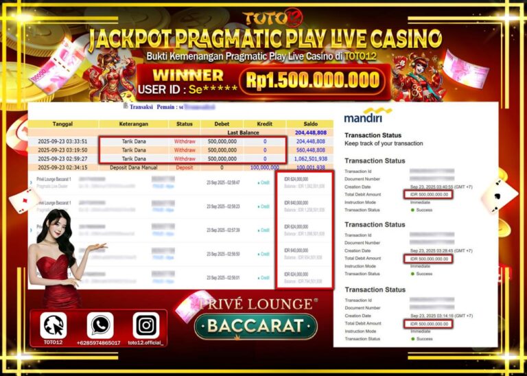 Selamat kepada Member Kami Se***** Telah Jackpot dan berhasil mendapatkan kemenangan besar pada permainan JACKPOT PRAGMATIC PLAY LIVE CASINO (PRIVE LOUNGE BACCARAT 1) Dengan Kemenangan Sebesar Rp.1.500.000.000–. Setelah mengisi Fomulir Withdraw dengan Kurang waktu 1-2 Menit Dana sudah kami Trasnfer kepada Pemilik Userid dan dana sudah dapat di cairkan oleh pemenang. Bukti Pembayaran yang TOTO12 berikan…