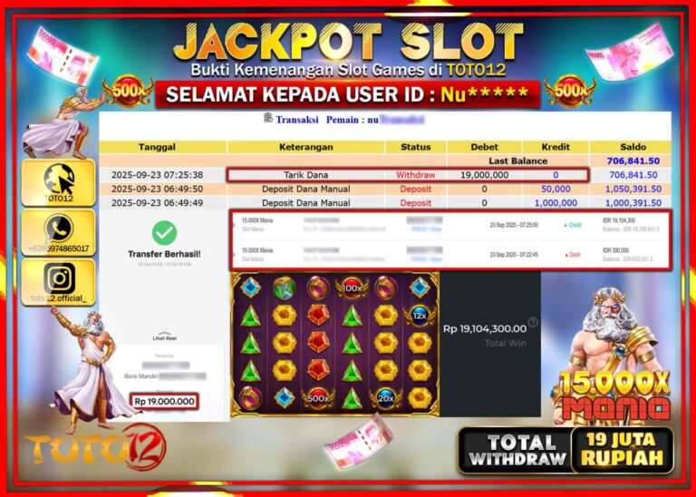 Selamat kepada Member Kami Nu****** Telah Jackpot dan berhasil mendapatkan kemenangan besar pada permainan JACKPOT SLOT GAME (15.000X MANIA) Dengan Kemenangan Sebesar Rp.19.000.000 –. Setelah mengisi Fomulir Withdraw dengan Kurang waktu 1-2 Menit Dana sudah kami Trasnfer kepada Pemilik Userid dan dana sudah dapat di cairkan oleh pemenang. Bukti Pembayaran yang TOTO12 berikan merupakan Bukti Pembayaran…