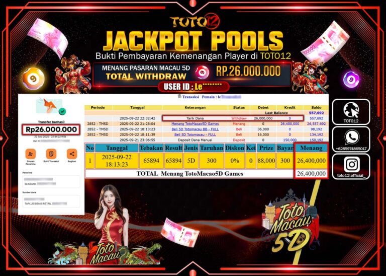 Selamat kepada Member Kami Le****** Telah Jackpot dan berhasil mendapatkan kemenangan besar pada permainan JACKPOT POOLS PASARAN (MACAU 5D) Dengan Kemenangan Sebesar Rp.26.000.000 –. Setelah mengisi Fomulir Withdraw dengan Kurang waktu 1-2 Menit Dana sudah kami Trasnfer kepada Pemilik Userid dan dana sudah dapat di cairkan oleh pemenang. Bukti Pembayaran yang TOTO12 berikan merupakan Bukti Pembayaran…