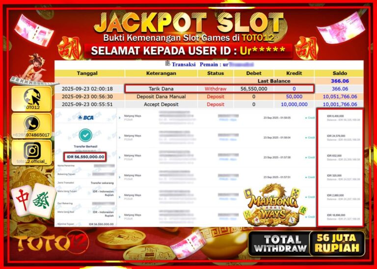 Selamat kepada Member Kami Ur***** Telah Jackpot dan berhasil mendapatkan kemenangan besar pada permainan JACKPOT SLOT GAME (MAHJONG WAYS) Dengan Kemenangan Sebesar Rp.56.550.000–. Setelah mengisi Fomulir Withdraw dengan Kurang waktu 1-2 Menit Dana sudah kami Trasnfer kepada Pemilik Userid dan dana sudah dapat di cairkan oleh pemenang. Bukti Pembayaran yang TOTO12 berikan merupakan Bukti Pembayaran yang …
