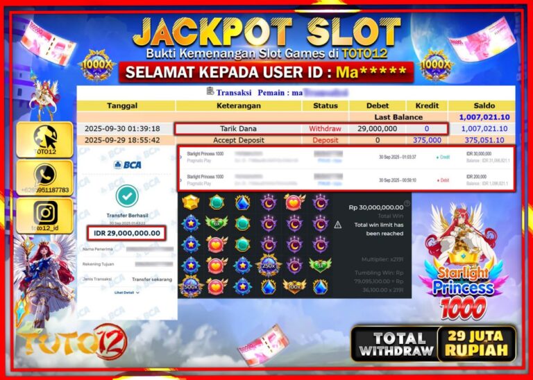 Selamat kepada Member Kami Ma****** Telah Jackpot dan berhasil mendapatkan kemenangan besar pada permainan JACKPOT SLOT GAME (STARLIGHT PRINCESS 1000) Dengan Kemenangan Sebesar Rp.29.000.000 –. Setelah mengisi Fomulir Withdraw dengan Kurang waktu 1-2 Menit Dana sudah kami Trasnfer kepada Pemilik Userid dan dana sudah dapat di cairkan oleh pemenang. Bukti Pembayaran yang TOTO12 berikan merupakan Bukti…