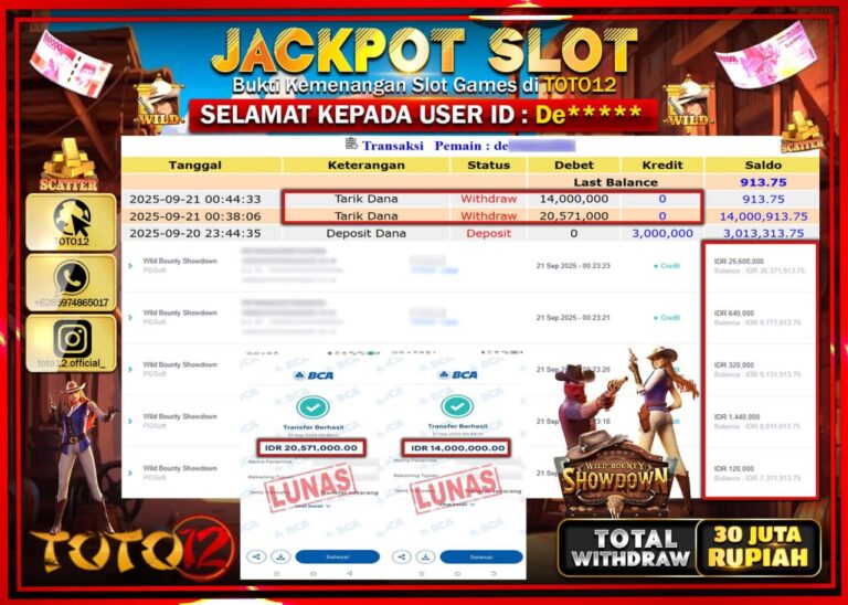 Selamat kepada Member Kami Me****** Telah Jackpot dan berhasil mendapatkan kemenangan besar pada permainan JACKPOT SLOT GAME (WILD BOUNTY SHOWDOWN) Dengan Kemenangan Sebesar Rp.30.204.000 –. Setelah mengisi Fomulir Withdraw dengan Kurang waktu 1-2 Menit Dana sudah kami Trasnfer kepada Pemilik Userid dan dana sudah dapat di cairkan oleh pemenang. Bukti Pembayaran yang TOTO12 berikan merupakan Bukti…