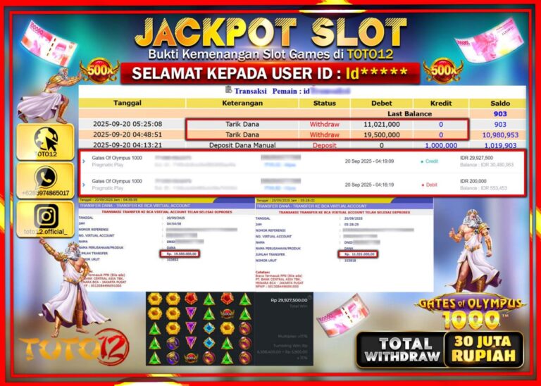 Selamat kepada Member Kami Pa****** Telah Jackpot dan berhasil mendapatkan kemenangan besar pada permainan JACKPOT SLOT GAME (GATES OF OLYMPUS SUPER SCATTER) Dengan Kemenangan Sebesar Rp.20.000.000 –. Setelah mengisi Fomulir Withdraw dengan Kurang waktu 1-2 Menit Dana sudah kami Trasnfer kepada Pemilik Userid dan dana sudah dapat di cairkan oleh pemenang. Bukti Pembayaran yang TOTO12 berikan…