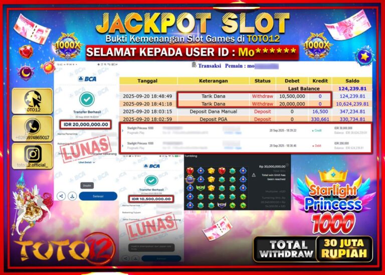 Selamat kepada Member Kami Mo****** Telah Jackpot dan berhasil mendapatkan kemenangan besar pada permainan JACKPOT SLOT GAME (STARLIGHT PRINCESS 1000) Dengan Kemenangan Sebesar Rp.30.500.000 –. Setelah mengisi Fomulir Withdraw dengan Kurang waktu 1-2 Menit Dana sudah kami Trasnfer kepada Pemilik Userid dan dana sudah dapat di cairkan oleh pemenang. Bukti Pembayaran yang TOTO12 berikan merupakan Bukti…