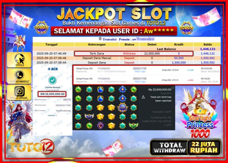 Selamat kepada Member Kami Aw****** Telah Jackpot dan berhasil mendapatkan kemenangan besar pada permainan JACKPOT SLOT GAME (STARLIGHT PRINCESS 1000) Dengan Kemenangan Sebesar Rp.22.000.000 –. Setelah mengisi Fomulir Withdraw dengan Kurang waktu 1-2 Menit Dana sudah kami Trasnfer kepada Pemilik Userid dan dana sudah dapat di cairkan oleh pemenang. Bukti Pembayaran yang TOTO12 berikan merupakan Bukti…