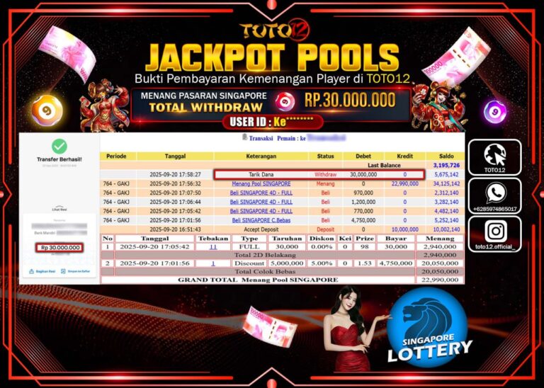 Selamat kepada Member Kami Ke****** Telah Jackpot dan berhasil mendapatkan kemenangan besar pada permainan JACKPOT POOLS PASARAN (SINGAPORE) Dengan Kemenangan Sebesar Rp.30.000.000 –. Setelah mengisi Fomulir Withdraw dengan Kurang waktu 1-2 Menit Dana sudah kami Trasnfer kepada Pemilik Userid dan dana sudah dapat di cairkan oleh pemenang. Bukti Pembayaran yang TOTO12 berikan merupakan Bukti Pembayaran yang …