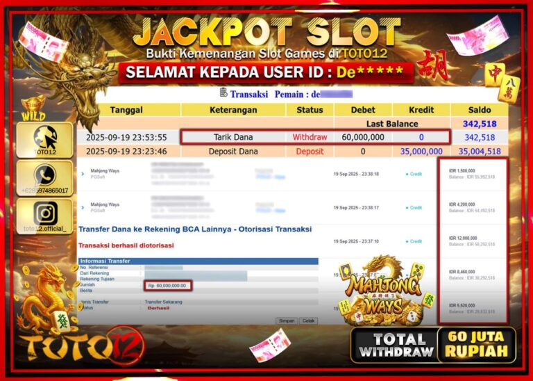 Selamat kepada Member Kami De****** Telah Jackpot dan berhasil mendapatkan kemenangan besar pada permainan JACKPOT SLOT GAME (MAHJONG WAYS) Dengan Kemenangan Sebesar Rp.60.000.000 –. Setelah mengisi Fomulir Withdraw dengan Kurang waktu 1-2 Menit Dana sudah kami Trasnfer kepada Pemilik Userid dan dana sudah dapat di cairkan oleh pemenang. Bukti Pembayaran yang TOTO12 berikan merupakan Bukti Pembayaran…