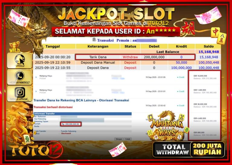 Selamat kepada Member Kami An****** Telah Jackpot dan berhasil mendapatkan kemenangan besar pada permainan JACKPOT SLOT GAME (MAHJONG WAYS) Dengan Kemenangan Sebesar Rp.200.000.000 –. Setelah mengisi Fomulir Withdraw dengan Kurang waktu 1-2 Menit Dana sudah kami Trasnfer kepada Pemilik Userid dan dana sudah dapat di cairkan oleh pemenang. Bukti Pembayaran yang TOTO12 berikan merupakan Bukti Pembayaran…