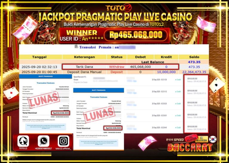 Selamat kepada Member Kami An****** Telah Jackpot dan berhasil mendapatkan kemenangan besar pada permainan JACKPOT PRAGMATIC PLAY LIVE CASINO (SPEED BACCARAT 16 KOREAN) Dengan Kemenangan Sebesar Rp.465.068.000 –. Setelah mengisi Fomulir Withdraw dengan Kurang waktu 1-2 Menit Dana sudah kami Trasnfer kepada Pemilik Userid dan dana sudah dapat di cairkan oleh pemenang. Bukti Pembayaran yang TOTO12…