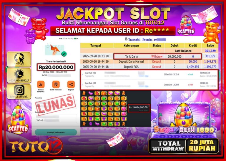 Selamat kepada Member Kami Re****** Telah Jackpot dan berhasil mendapatkan kemenangan besar pada permainan JACKPOT SLOT GAME (SUGAR RUSH 1000) Dengan Kemenangan Sebesar Rp.20.000.000 –. Setelah mengisi Fomulir Withdraw dengan Kurang waktu 1-2 Menit Dana sudah kami Trasnfer kepada Pemilik Userid dan dana sudah dapat di cairkan oleh pemenang. Bukti Pembayaran yang TOTO12 berikan merupakan Bukti…