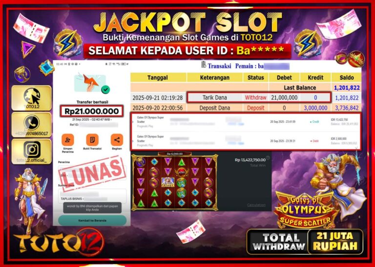 Selamat kepada Member Kami Ba****** Telah Jackpot dan berhasil mendapatkan kemenangan besar pada permainan JACKPOT SLOT GAME (GATES OF OLYMPUS SUPER SCATTER) Dengan Kemenangan Sebesar Rp.21.000.000 –. Setelah mengisi Fomulir Withdraw dengan Kurang waktu 1-2 Menit Dana sudah kami Trasnfer kepada Pemilik Userid dan dana sudah dapat di cairkan oleh pemenang. Bukti Pembayaran yang TOTO12 berikan…