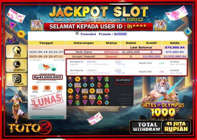 Selamat kepada Member Kami Ih****** Telah Jackpot dan berhasil mendapatkan kemenangan besar pada permainan JACKPOT SLOT GAME (GATES OF OLYMPUS 1000) Dengan Kemenangan Sebesar Rp.41.000.000 –. Setelah mengisi Fomulir Withdraw dengan Kurang waktu 1-2 Menit Dana sudah kami Trasnfer kepada Pemilik Userid dan dana sudah dapat di cairkan oleh pemenang. Bukti Pembayaran yang TOTO12 berikan merupakan…