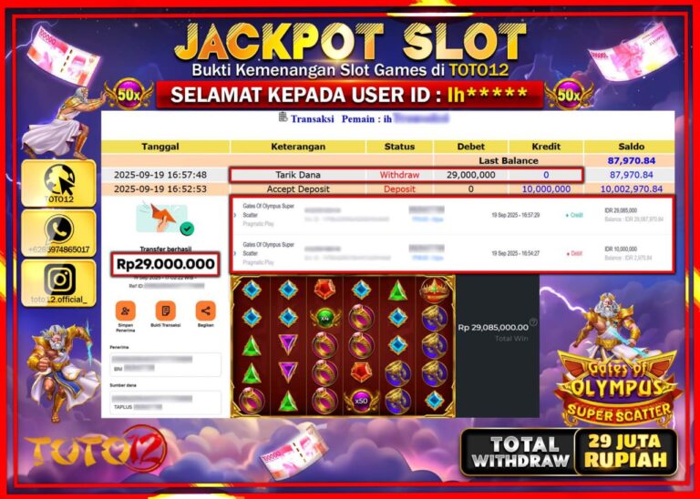 Selamat kepada Member Kami Ih****** Telah Jackpot dan berhasil mendapatkan kemenangan besar pada permainan JACKPOT SLOT GAME (GATES OF OLYMPUS SUPER SCATTER) Dengan Kemenangan Sebesar Rp.29.000.000 –. Setelah mengisi Fomulir Withdraw dengan Kurang waktu 1-2 Menit Dana sudah kami Trasnfer kepada Pemilik Userid dan dana sudah dapat di cairkan oleh pemenang. Bukti Pembayaran yang TOTO12 berikan…