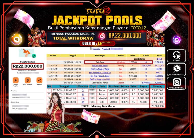 Selamat kepada Member Kami Le****** Telah Jackpot dan berhasil mendapatkan kemenangan besar pada permainan JACKPOT POOLS PASARAN (MACAU 5D) Dengan Kemenangan Sebesar Rp.22.000.000 –. Setelah mengisi Fomulir Withdraw dengan Kurang waktu 1-2 Menit Dana sudah kami Trasnfer kepada Pemilik Userid dan dana sudah dapat di cairkan oleh pemenang. Bukti Pembayaran yang TOTO12 berikan merupakan Bukti Pembayaran…