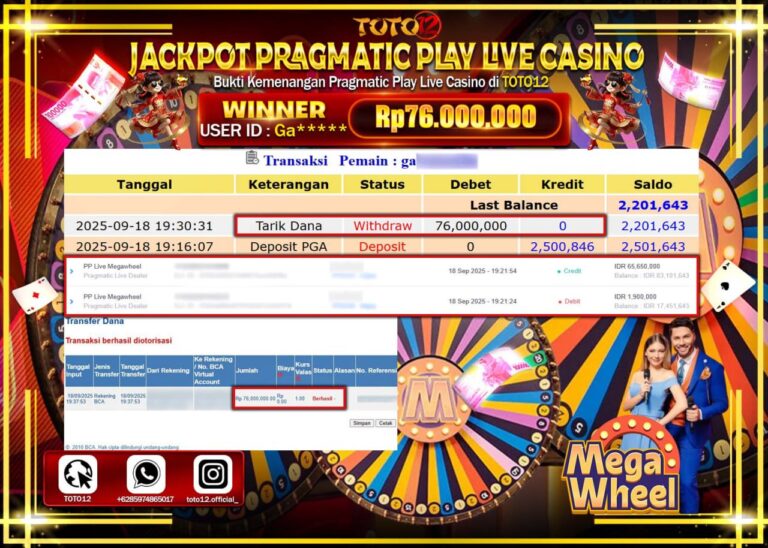 Selamat kepada Member Kami Ga****** Telah Jackpot dan berhasil mendapatkan kemenangan besar pada permainan JACKPOT PRAGMATIC PLAY LIVE CASINO (MEGA WHEEL) Dengan Kemenangan Sebesar Rp.76.000.000 –. Setelah mengisi Fomulir Withdraw dengan Kurang waktu 1-2 Menit Dana sudah kami Trasnfer kepada Pemilik Userid dan dana sudah dapat di cairkan oleh pemenang. Bukti Pembayaran yang TOTO12 berikan merupakan…