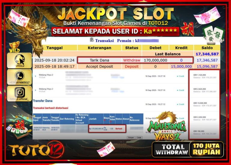 Selamat kepada Member Kami Ka****** Telah Jackpot dan berhasil mendapatkan kemenangan besar pada permainan JACKPOT SLOT GAME (MAHJONG WAYS 2) Dengan Kemenangan Sebesar Rp.170.000.000 –. Setelah mengisi Fomulir Withdraw dengan Kurang waktu 1-2 Menit Dana sudah kami Trasnfer kepada Pemilik Userid dan dana sudah dapat di cairkan oleh pemenang. Bukti Pembayaran yang TOTO12 berikan merupakan Bukti…