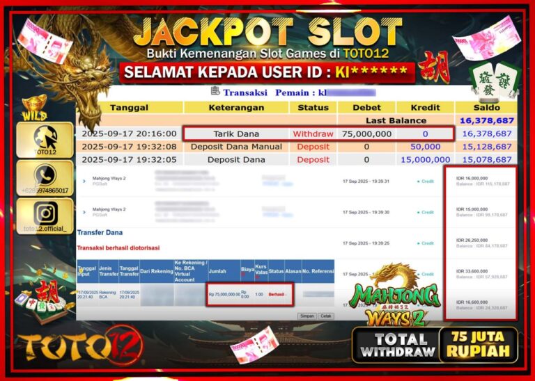 Selamat kepada Member Kami Kl****** Telah Jackpot dan berhasil mendapatkan kemenangan besar pada permainan JACKPOT SLOT GAME (MAHJONG WAYS 2) Dengan Kemenangan Sebesar Rp.75.000.000 –. Setelah mengisi Fomulir Withdraw dengan Kurang waktu 1-2 Menit Dana sudah kami Trasnfer kepada Pemilik Userid dan dana sudah dapat di cairkan oleh pemenang. Bukti Pembayaran yang TOTO12 berikan merupakan Bukti…