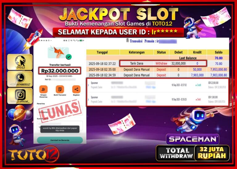 Selamat kepada Member Kami Ir****** Telah Jackpot dan berhasil mendapatkan kemenangan besar pada permainan JACKPOT SLOT GAME (SPACEMAN) Dengan Kemenangan Sebesar Rp.32.000.000 –. Setelah mengisi Fomulir Withdraw dengan Kurang waktu 1-2 Menit Dana sudah kami Trasnfer kepada Pemilik Userid dan dana sudah dapat di cairkan oleh pemenang. Bukti Pembayaran yang TOTO12 berikan merupakan Bukti Pembayaran yang …