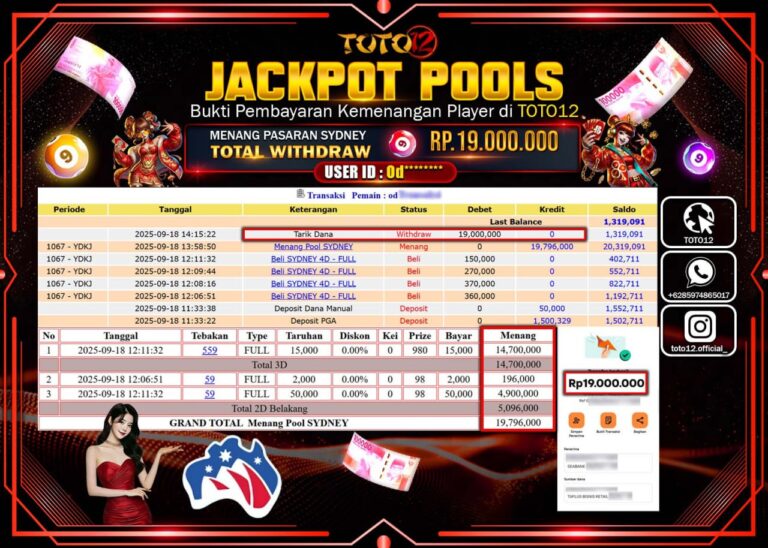 Selamat kepada Member Kami Od****** Telah Jackpot dan berhasil mendapatkan kemenangan besar pada permainan JACKPOT POOLS PASARAN (SYDNEY) Dengan Kemenangan Sebesar Rp.19.000.000 –. Setelah mengisi Fomulir Withdraw dengan Kurang waktu 1-2 Menit Dana sudah kami Trasnfer kepada Pemilik Userid dan dana sudah dapat di cairkan oleh pemenang. Bukti Pembayaran yang TOTO12 berikan merupakan Bukti Pembayaran yang …