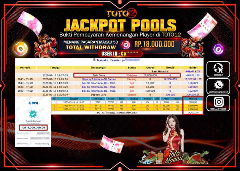 Selamat kepada Member Kami Go****** Telah Jackpot dan berhasil mendapatkan kemenangan besar pada permainan JACKPOT POOLS PASARAN (MACAU 5D) Dengan Kemenangan Sebesar Rp.18.000.000 –. Setelah mengisi Fomulir Withdraw dengan Kurang waktu 1-2 Menit Dana sudah kami Trasnfer kepada Pemilik Userid dan dana sudah dapat di cairkan oleh pemenang. Bukti Pembayaran yang TOTO12 berikan merupakan Bukti Pembayaran…