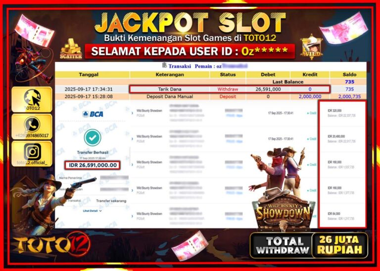 Selamat kepada Member Kami Oz****** Telah Jackpot dan berhasil mendapatkan kemenangan besar pada permainan JACKPOT SLOT GAME (WILD BOUNTY SHOWDOWN) Dengan Kemenangan Sebesar Rp.26.591.000 –. Setelah mengisi Fomulir Withdraw dengan Kurang waktu 1-2 Menit Dana sudah kami Trasnfer kepada Pemilik Userid dan dana sudah dapat di cairkan oleh pemenang. Bukti Pembayaran yang TOTO12 berikan merupakan Bukti…