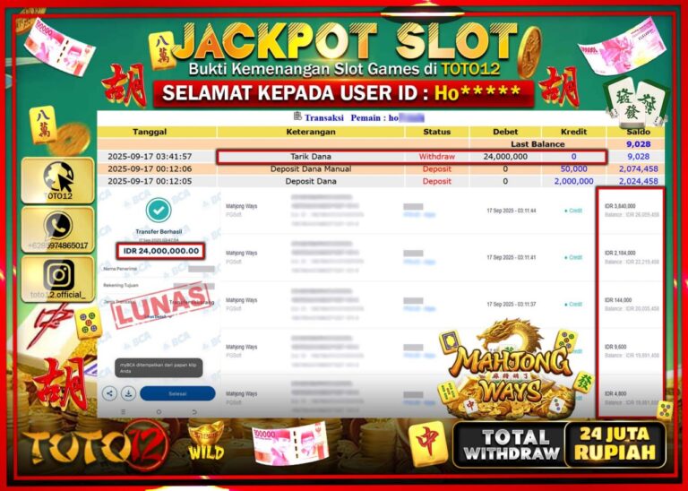 Selamat kepada Member Kami Ho****** Telah Jackpot dan berhasil mendapatkan kemenangan besar pada permainan JACKPOT SLOT GAME (MAHJONG WAYS) Dengan Kemenangan Sebesar Rp.24.000.000 –. Setelah mengisi Fomulir Withdraw dengan Kurang waktu 1-2 Menit Dana sudah kami Trasnfer kepada Pemilik Userid dan dana sudah dapat di cairkan oleh pemenang. Bukti Pembayaran yang TOTO12 berikan merupakan Bukti Pembayaran…