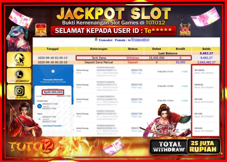 Selamat kepada Member Kami Te****** Telah Jackpot dan berhasil mendapatkan kemenangan besar pada permainan JACKPOT SLOT GAME (GEISHAS REVENGE) Dengan Kemenangan Sebesar Rp.25.000.000 –. Setelah mengisi Fomulir Withdraw dengan Kurang waktu 1-2 Menit Dana sudah kami Trasnfer kepada Pemilik Userid dan dana sudah dapat di cairkan oleh pemenang. Bukti Pembayaran yang TOTO12 berikan merupakan Bukti Pembayaran…