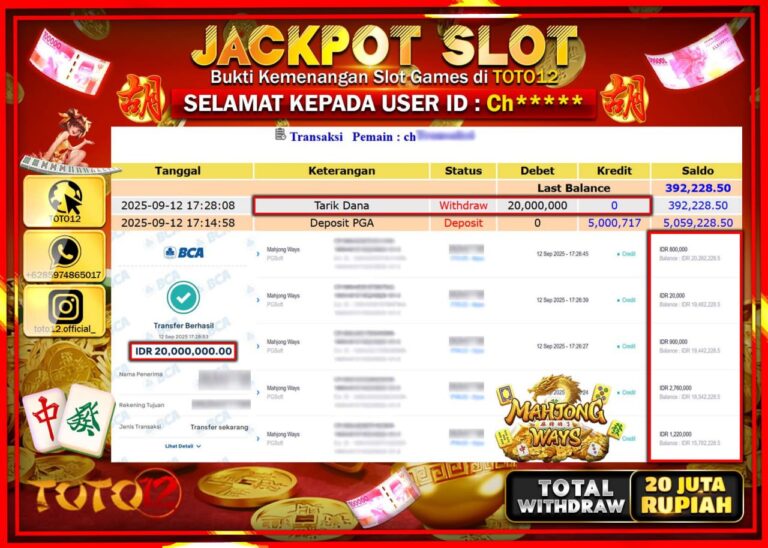 Selamat kepada Member Kami Ch****** Telah Jackpot dan berhasil mendapatkan kemenangan besar pada permainan JACKPOT SLOT GAME (MAHJONG WAYS) Dengan Kemenangan Sebesar Rp.20.000.000 –. Setelah mengisi Fomulir Withdraw dengan Kurang waktu 1-2 Menit Dana sudah kami Trasnfer kepada Pemilik Userid dan dana sudah dapat di cairkan oleh pemenang. Bukti Pembayaran yang TOTO12 berikan merupakan Bukti Pembayaran…