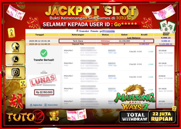 Selamat kepada Member Kami Go****** Telah Jackpot dan berhasil mendapatkan kemenangan besar pada permainan JACKPOT SLOT GAME (MAHJONG WAYS 2) Dengan Kemenangan Sebesar Rp.22.150.000 –. Setelah mengisi Fomulir Withdraw dengan Kurang waktu 1-2 Menit Dana sudah kami Trasnfer kepada Pemilik Userid dan dana sudah dapat di cairkan oleh pemenang. Bukti Pembayaran yang TOTO12 berikan merupakan Bukti…