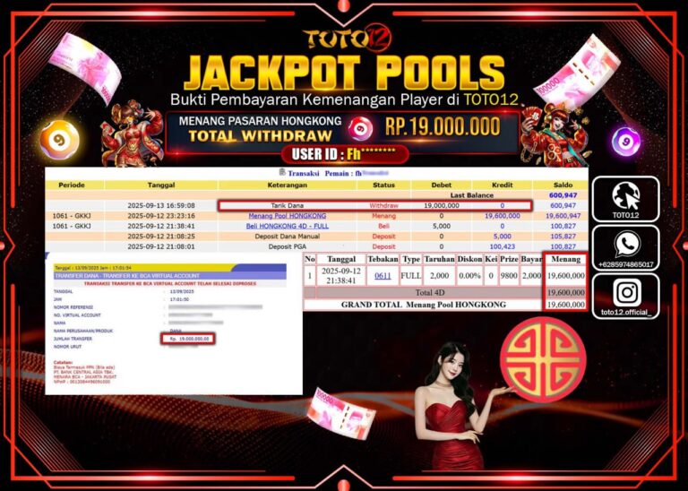 Selamat kepada Member Kami Fh****** Telah Jackpot dan berhasil mendapatkan kemenangan besar pada permainan JACKPOT POOLS PASARAN (HONGKONG) Dengan Kemenangan Sebesar Rp.19.000.000 –. Setelah mengisi Fomulir Withdraw dengan Kurang waktu 1-2 Menit Dana sudah kami Trasnfer kepada Pemilik Userid dan dana sudah dapat di cairkan oleh pemenang. Bukti Pembayaran yang TOTO12 berikan merupakan Bukti Pembayaran yang …