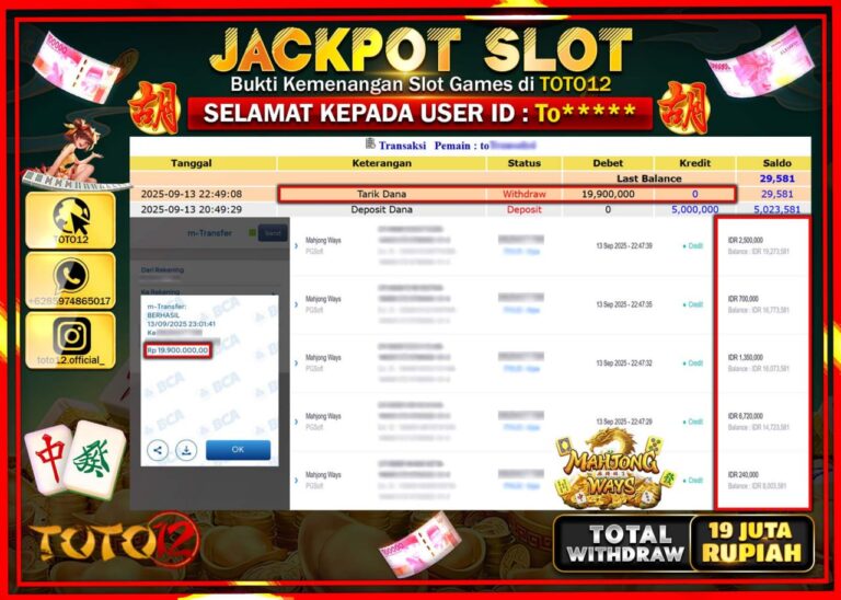 Selamat kepada Member Kami To****** Telah Jackpot dan berhasil mendapatkan kemenangan besar pada permainan JACKPOT SLOT GAME (MAHJONG WAYS) Dengan Kemenangan Sebesar Rp.19.900.000 –. Setelah mengisi Fomulir Withdraw dengan Kurang waktu 1-2 Menit Dana sudah kami Trasnfer kepada Pemilik Userid dan dana sudah dapat di cairkan oleh pemenang. Bukti Pembayaran yang TOTO12 berikan merupakan Bukti Pembayaran…