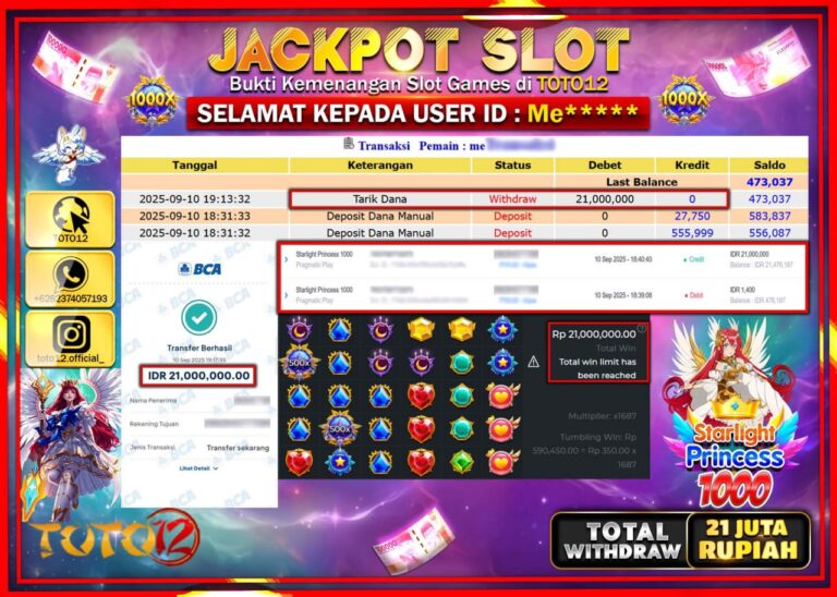 Selamat kepada Member Kami Me****** Telah Jackpot dan berhasil mendapatkan kemenangan besar pada permainan JACKPOT SLOT GAME (STARLIGHT PRINCESS 1000) Dengan Kemenangan Sebesar Rp.21.000.000 –. Setelah mengisi Fomulir Withdraw dengan Kurang waktu 1-2 Menit Dana sudah kami Trasnfer kepada Pemilik Userid dan dana sudah dapat di cairkan oleh pemenang. Bukti Pembayaran yang TOTO12 berikan merupakan Bukti…