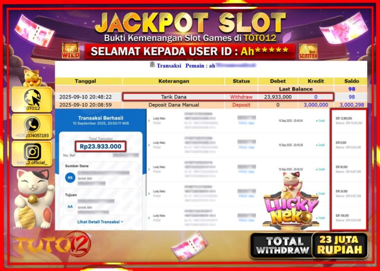 Selamat kepada Member Kami Ah****** Telah Jackpot dan berhasil mendapatkan kemenangan besar pada permainan JACKPOT SLOT GAME (LUCKY NEKO) Dengan Kemenangan Sebesar Rp.23.9330.000 –. Setelah mengisi Fomulir Withdraw dengan Kurang waktu 1-2 Menit Dana sudah kami Trasnfer kepada Pemilik Userid dan dana sudah dapat di cairkan oleh pemenang. Bukti Pembayaran yang TOTO12 berikan merupakan Bukti Pembayaran…