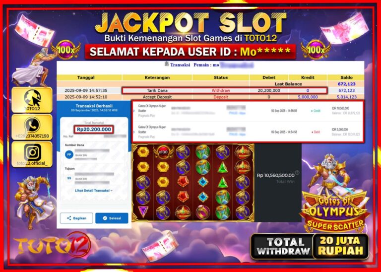 Selamat kepada Member Kami Mo****** Telah Jackpot dan berhasil mendapatkan kemenangan besar pada permainan JACKPOT SLOT GAME (GATES OF OLYMPUS SUPER SCATTER) Dengan Kemenangan Sebesar Rp.20.200.000 –. Setelah mengisi Fomulir Withdraw dengan Kurang waktu 1-2 Menit Dana sudah kami Trasnfer kepada Pemilik Userid dan dana sudah dapat di cairkan oleh pemenang. Bukti Pembayaran yang TOTO12 berikan…