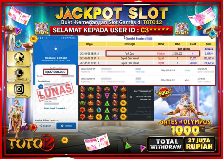 Selamat kepada Member Kami C3****** Telah Jackpot dan berhasil mendapatkan kemenangan besar pada permainan JACKPOT SLOT GAME (GATES OF OLYMPUS 1000) Dengan Kemenangan Sebesar Rp.27.000.000 –. Setelah mengisi Fomulir Withdraw dengan Kurang waktu 1-2 Menit Dana sudah kami Trasnfer kepada Pemilik Userid dan dana sudah dapat di cairkan oleh pemenang. Bukti Pembayaran yang TOTO12 berikan merupakan…