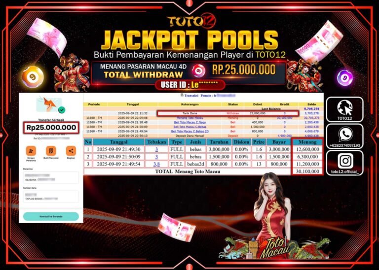 Selamat kepada Member Kami Le****** Telah Jackpot dan berhasil mendapatkan kemenangan besar pada permainan JACKPOT POOLS PASARAN (TOTO MACAU) Dengan Kemenangan Sebesar Rp.25.000.000 –. Setelah mengisi Fomulir Withdraw dengan Kurang waktu 1-2 Menit Dana sudah kami Trasnfer kepada Pemilik Userid dan dana sudah dapat di cairkan oleh pemenang. Bukti Pembayaran yang TOTO12 berikan merupakan Bukti Pembayaran…
