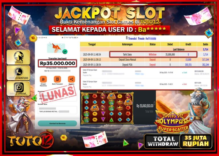 Selamat kepada Member Kami Ba****** Telah Jackpot dan berhasil mendapatkan kemenangan besar pada permainan JACKPOT SLOT GAME (GATES OF OLYMPUS SUPER SCATTER) Dengan Kemenangan Sebesar Rp.35.000.000 –. Setelah mengisi Fomulir Withdraw dengan Kurang waktu 1-2 Menit Dana sudah kami Trasnfer kepada Pemilik Userid dan dana sudah dapat di cairkan oleh pemenang. Bukti Pembayaran yang TOTO12 berikan…