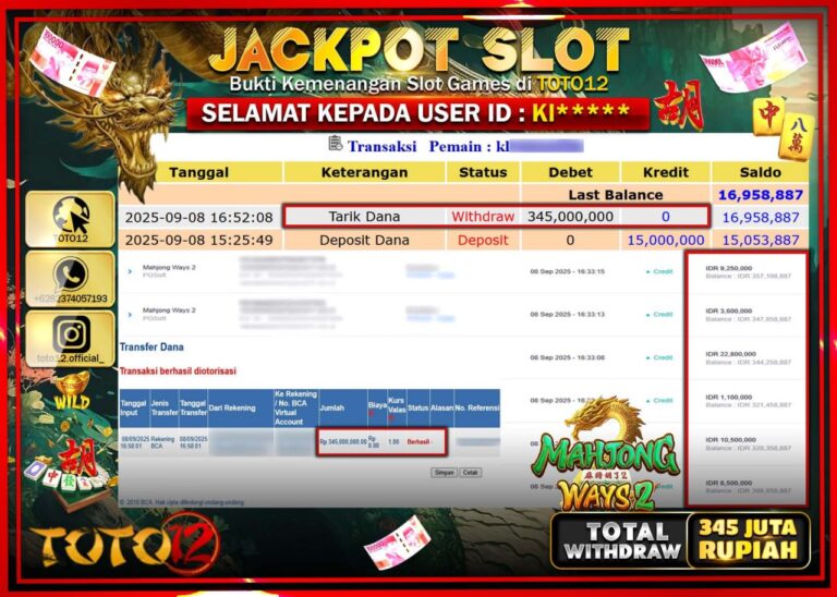 Selamat kepada Member Kami Kl****** Telah Jackpot dan berhasil mendapatkan kemenangan besar pada permainan JACKPOT SLOT GAME (MAHJONG WAYS 2) Dengan Kemenangan Sebesar Rp.345.000.000 –. Setelah mengisi Fomulir Withdraw dengan Kurang waktu 1-2 Menit Dana sudah kami Trasnfer kepada Pemilik Userid dan dana sudah dapat di cairkan oleh pemenang. Bukti Pembayaran yang TOTO12 berikan merupakan Bukti…
